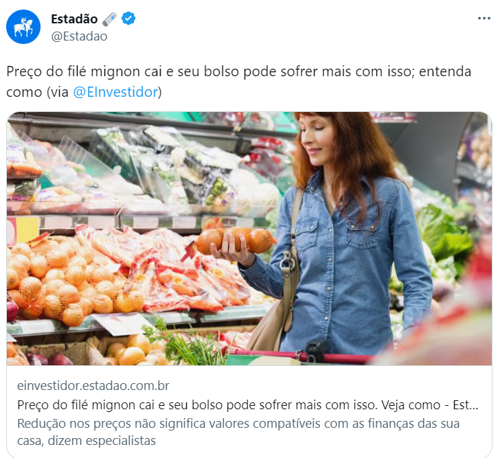 Intitulada “Preço do filé mignon cai e seu bolso pode sofrer mais com isso”, o Estadão trouxe a opinião de dois especialistas em Economia.