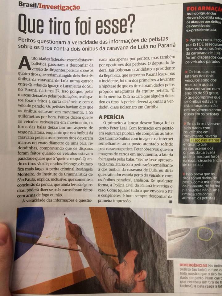 Não autorizei o uso da minha imagem na reportagem da revista Istoé sobre o atentado à caravana do ex-presidente Lula. Aproximei o dedo da marca causada pela bala a pedido de um fotógrafo, que queria dar a dimensão da circunferência do buraco em relação a um dedo humano. Em vez de modelo fotográfico, eu poderia servir como fonte para a matéria. Estava dentro do ônibus, ouvi o disparo, e certamente ajudaria a desmentir a informação de que o tiro “foi armação”.
