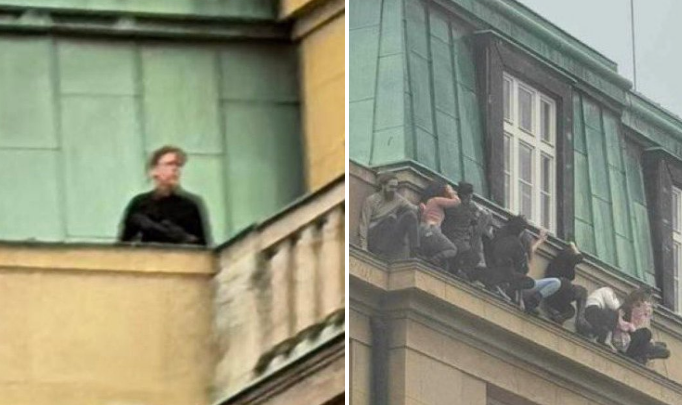 O autor do massacre na universidade de Praga e os estudantes procurando abrigo