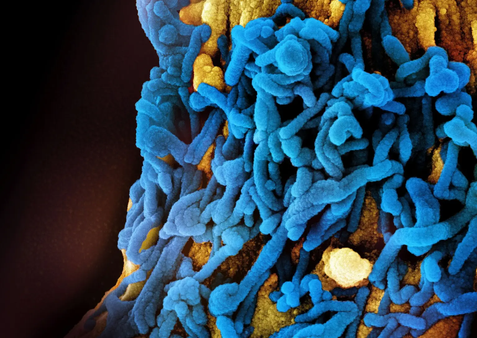 Partículas do vírus Marburg (azul) sobre uma célula infectada (NIAID / NIH)