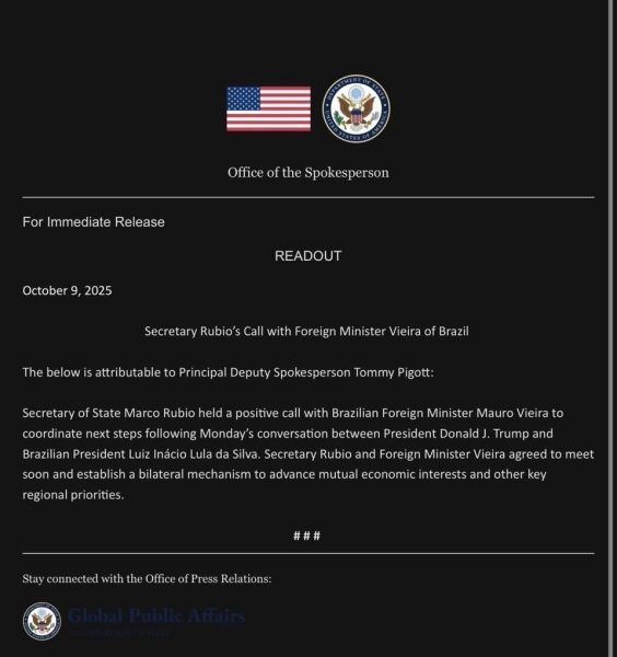 O Departamento de Estado dos Estados Unidos classificou como “positiva” a conversa entre o secretário americano Marco Rubio e o ministro das Relações Exteriores do Brasil, Mauro Vieira. A nota oficial divulgada nesta quinta (9) destacou que ambos concordaram em estabelecer um mecanismo bilateral para fortalecer os laços econômicos e tratar de prioridades regionais.