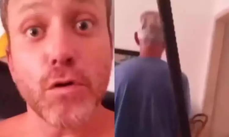 Ele mostra seu pai, que tenta desviar da câmera do celular do ator, e começa a fazer as ameaças com o bastão em mãos. “Pai, se você não me der mil reais eu vou ser obrigado a te matar, né? Você prefere que você me dê mil reais ou que eu te mate? Você é obrigado a me dar mil reais”, esbraveja.