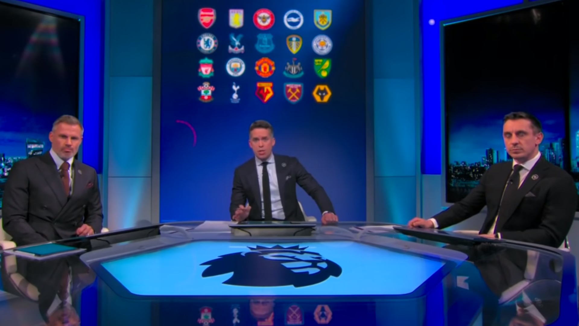 Do outro lado da mesa, o parceiro de Carragher no crime e também ex-jogador Gary Neville caiu na gargalhada. Enquanto isso, o apresentador David Jones, que muitas vezes tem a tarefa nada invejável de manter a dupla sob controle, lutava para entender a alegação.