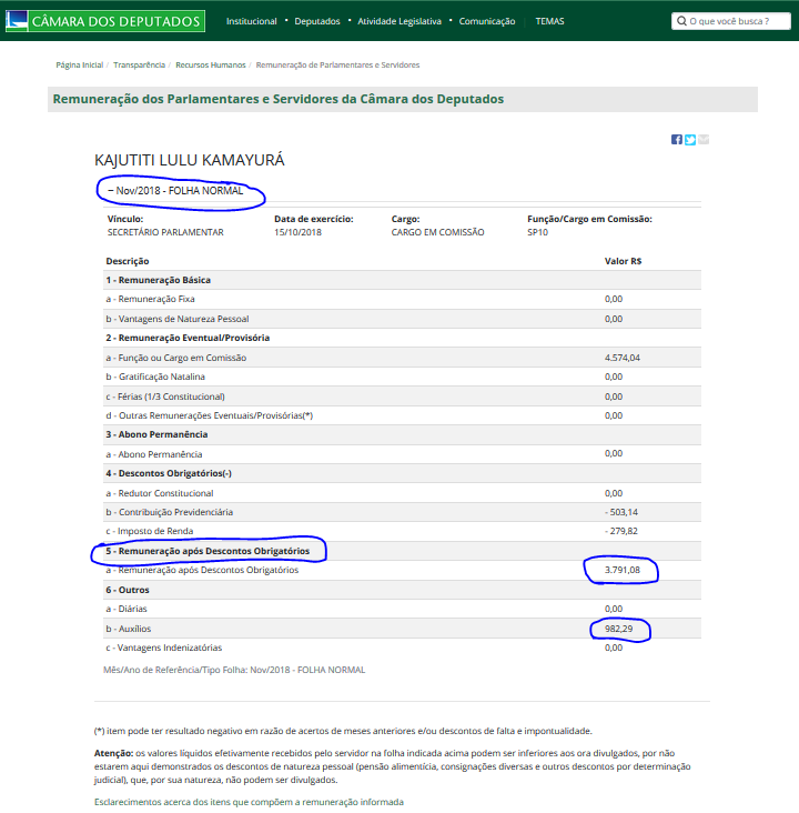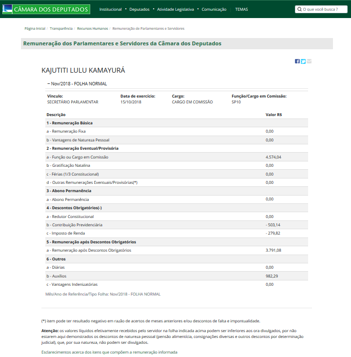 Pelo menos nesse período de outubro a dezembro, que pode ser comprovado através da página oficial da Câmara, a agora cristã Lulu recebeu ao todo, a título de salário, a quantia líquida de R$ 10.441,09.