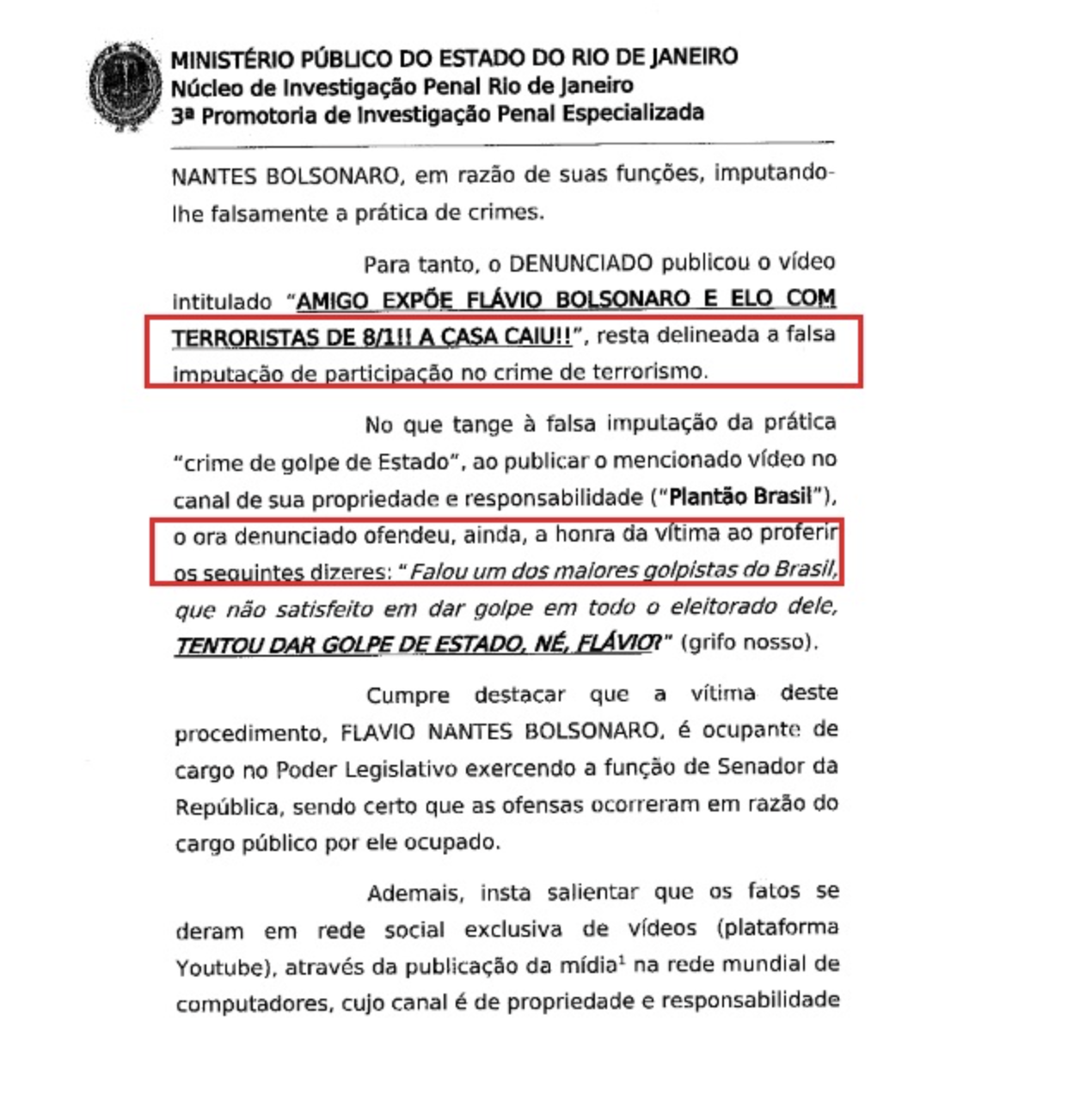O promotor do Ministério Público do Rio de Janeiro Alexandre Murilo Graça, da 3ª Promotoria de Investigação Penal Especializada, denunciou no último dia 26 o youtuber Thiago dos Reis à Justiça pelo suposto cometimento de três crimes, todos contra a honra do senador Flávio Bolsonaro (PL-RJ). O membro do MP-RJ pede que Reis seja condenado a uma pena total de quatro anos e dois meses de prisão.