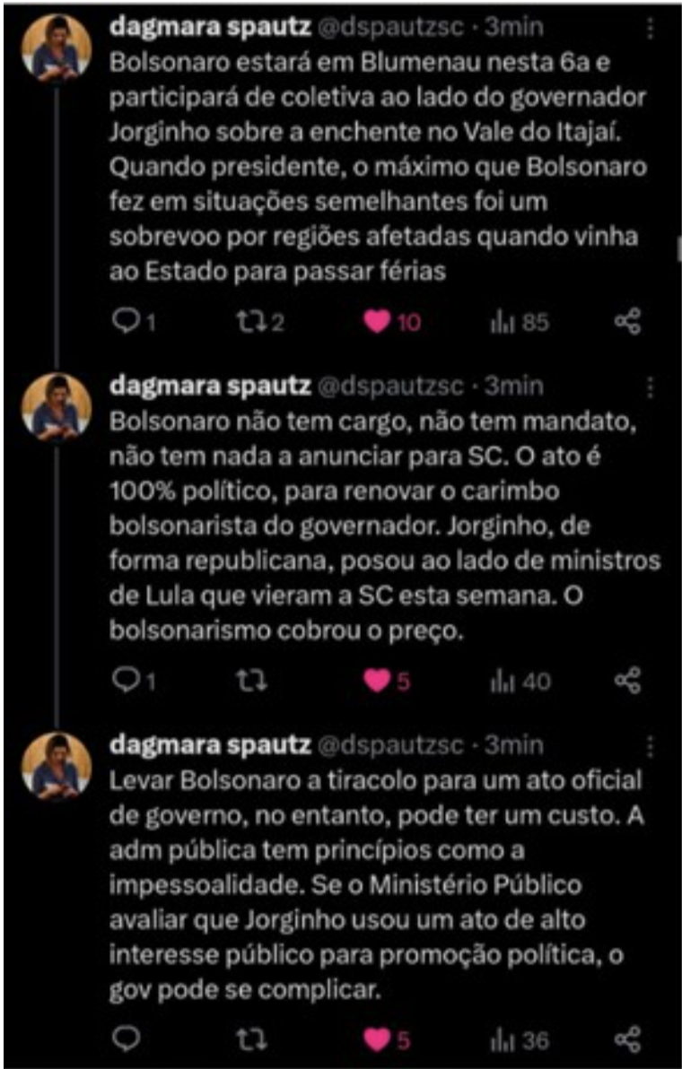 O Governador Jorginho Mello, usando a estrutura do Estado, levou o ex-presidente a sobrevoar áreas atingidas pelas enchentes. O ex-presidente prontamente se autopromoveu e utilizou do recurso publicitário pago com dinheiro público para postar em suas redes sociais, conferindo ampla publicidade à sua visita nada institucional às regiões catarinenses afetadas por enchentes e inundações.