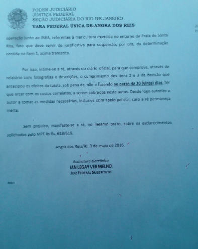 Um dos analistas ambientais que fazia parte da equipe conta que todos voltaram para Angra dos Reis e pediram o apoio da Polícia Federal. Alguns dias depois, retornaram para lá e fizeram o levantamento, que constatou diversas irregularidades na ocupação da área, como desmatamento sem autorização, construção acima do limite permitido e construção de equipamentos de lazer em área pública – no caso, a praia.