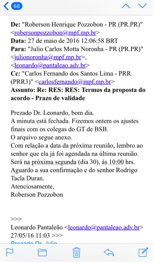 Apenas dois dias depois, em 27 de maio, o advogado de Tacla recebe um e-mail do procurador Roberson Henrique Pozzobon, com cópia para seu colega Carlos Fernando dos Santos Lima.
