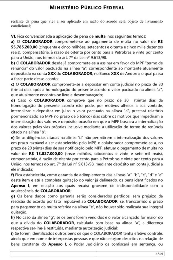“Se as diligências (…) não permitirem a internalização dos valores em prazo razoável a ser estabelecido pelo MPF, o colaborador compromete-se, no prazo de 20 dias de sua notificação pelo MPF, efetuar o pagamento de multa no valor de R$ 13.827.000,00 (os US$ 5 milhões na cotação do dia)”.