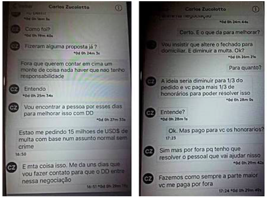 O primeiro, no print das telas do celular, com a suposta conversa com o advogado Carlos Zucolotto Junior, melhor amigo de Sérgio Moro e sócio de Rosângela Moro em escritório de advocacia.
