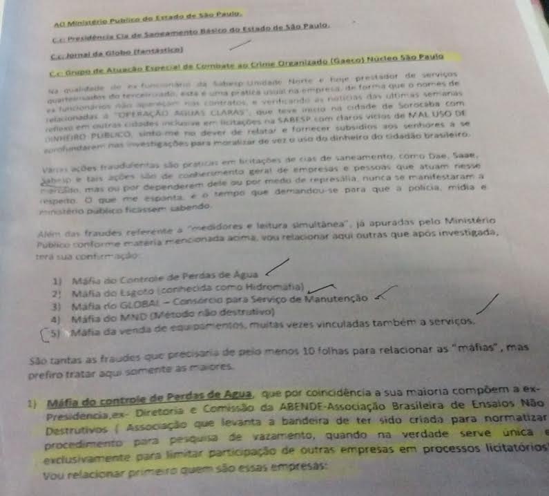 “Várias ações fraudulentas são praticadas em licitações de companhias de saneamento, como Dae, Saae, Sabesp e tais ações são de conhecimento geral de empresas e pessoas que atuam nesse mercado”. De acordo com o ex-funcionário, é inusitado como a polícia, a mídia e o ministério público não tiveram ciência de tais eventos, que ele define como uma formação de máfias de empresas marcadas nos setores de controle de perdas de água, esgoto, serviços de manutenção, métodos não destrutivos e equipamentos.