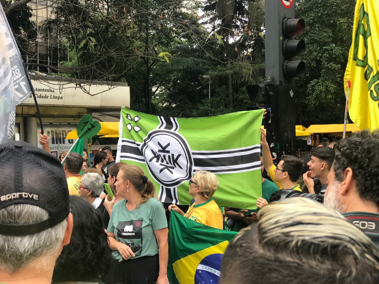 Ontem, pessoas aglutinaram-se em grupos antagonistas e foi preciso formar um cordão policial entre eles. E entre os camisas amarelas apoiadores do inominável, eis que surgiu a bandeira do Kekistan.