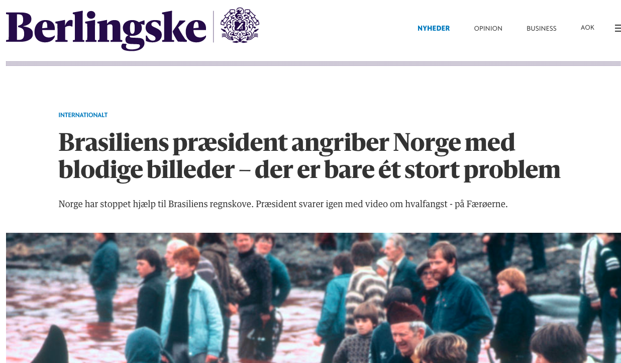 O jornal dinamarquês Berlingske, um dos maiores do país e dos mais antigos do mundo (fundado em 1749), deu matéria sobre a fake news de Bolsonaro no caso das baleias da Noruega que eram da Dinamarca.