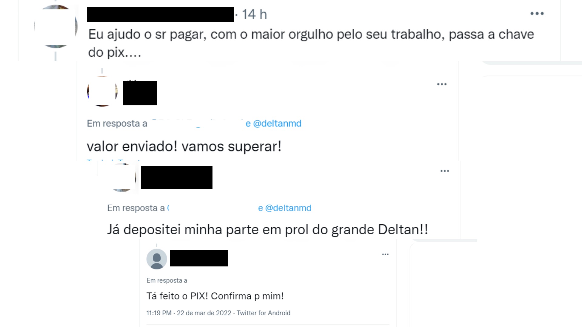 Outro declara que já fez sua doação: “Já depositei minha parte em prol do grande Deltan! Sugiro que todos os apoiadores façam o mesmo”. Entusiasmado, um usuário também confirma: “Valor enviado! Vamos superar!”. Mais um internauta mostra que caiu no conto do vigário: “Tá feito o PIX! Confirma pra mim!”