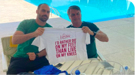 Tyrmand se reuniu também com Jair Bolsonaro e outro filho, o senador Flávio, na residência oficial do presidente brasileiro. Posaram para fotos segurando camisetas e toda a palhaçada.
