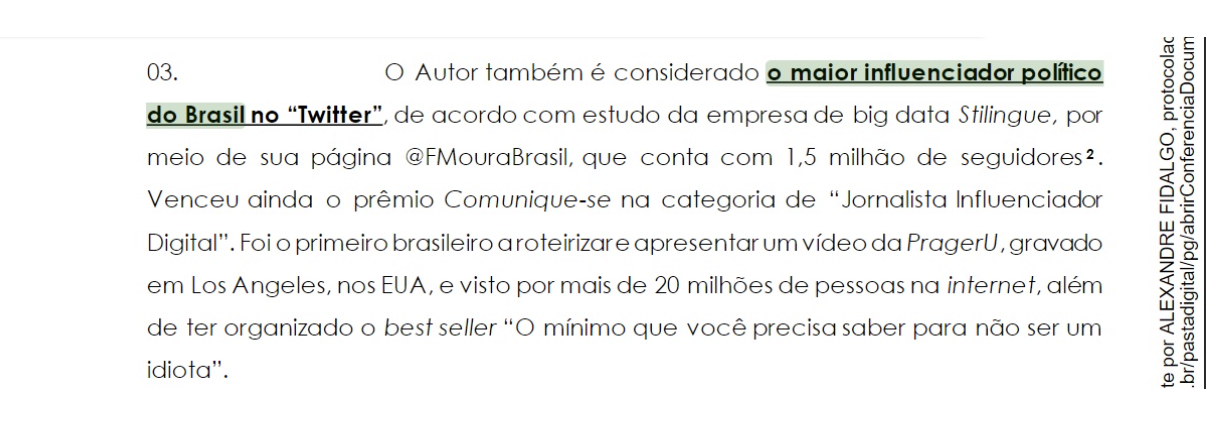 Logo no início de sua argumentação, o representante legal de Moura Brasil define seu cliente como “o maior influenciador político do Brasil”, além de organizador do livro “O Mínimo Que Você Precisa Saber Para Não Ser Um Idiota”, de Olavo de Carvalho (1947-2022), guru do bolsonarismo. Veja trecho abaixo.