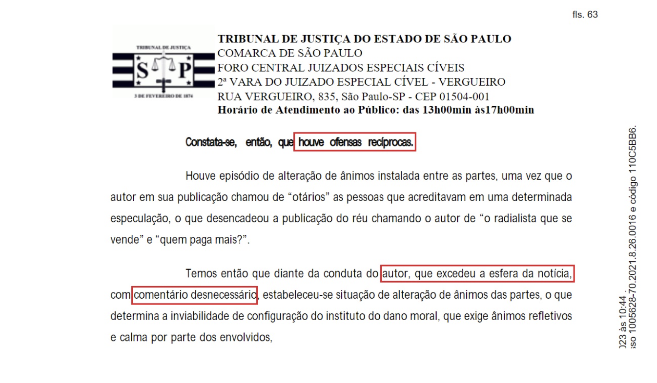 Ou, nas palavras do juiz, houve troca de ofensas no episódio, em que o autor (Felipe Moura) teceu comentário desnecessário e que ultrapassou a esfera da notícia, tendo faltado-lhe calma e ânimo reflexivo. Leia trecho da sentença, abaixo.