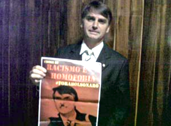 “Não vou colar o cartaz na parede do gabinete. Só estou com ele aqui para mostrar. Se fosse eu, seria quebra de decoro, mas como são eles, pode”, afirma Bolsonaro.