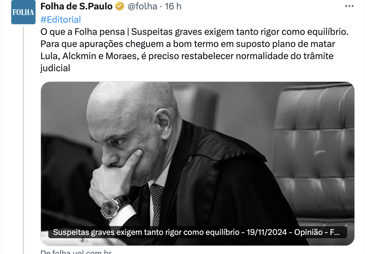 O jornal lembra que houve “uma operação da Polícia Federal que investiga nada menos que um plano ruminado entre militares, no final de 2022, para assassinar o então presidente eleito, Luiz Inácio Lula da Silva (PT), seu vice, Geraldo Alckmin (PSB), e o ministro Alexandre de Moraes, do Supremo Tribunal Federal e, na época, chefe da Justiça Eleitoral”.