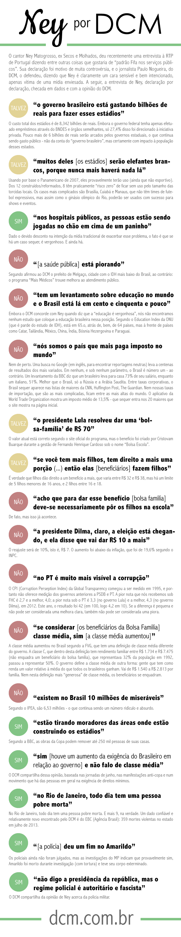 Fomos atrás dos dados e descobrimos exatamente em quais declarações à TV portuguesa Ney Matogrosso errou e acertou Publicado por Diario do Centro do Mundo - Atualizado em 13 de maio de 2014 às 21:49 Apoie o DCM Participe de nossos canais e nos siga nas redes sociais: