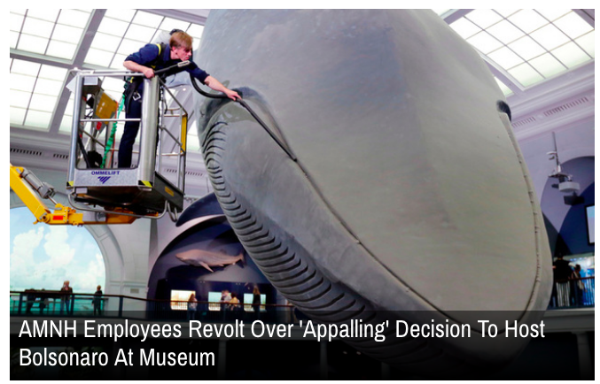 O Museu de História Natural dos Estados Unidos (AMNH) está enfrentando uma insurreição interna – e a ameaça de demissões e boicotes de funcionários – por sua recusa em cancelar uma festa de gala no mês que vem homenageando o presidente brasileiro Jair Bolsonaro. (…)