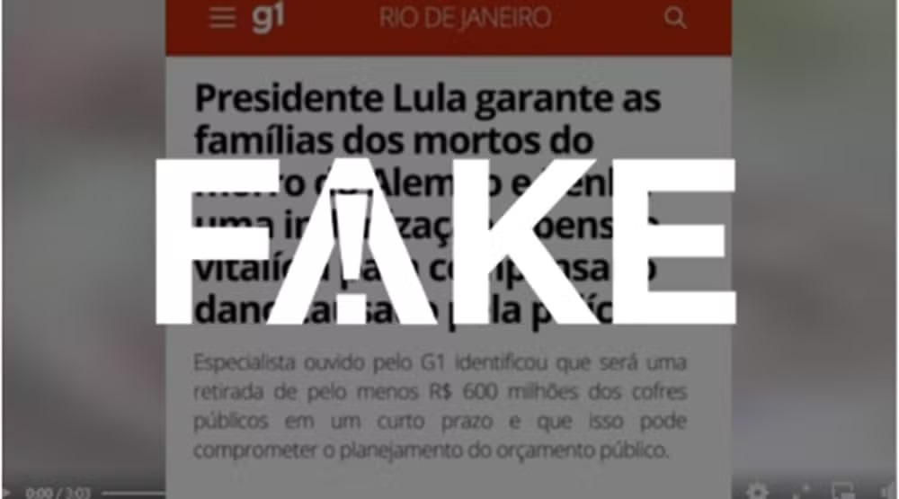Circula nas redes sociais, desde esta terça-feira (4), uma imagem que imita a aparência editorial do g1 e afirma que o presidente Lula garantiu indenização e pensão vitalícia a famílias de mortos na megaoperação policial realizada nos complexos do Alemão e da Penha, no Rio de Janeiro. A peça digital usa título e subtítulo falsos atribuídos ao portal.