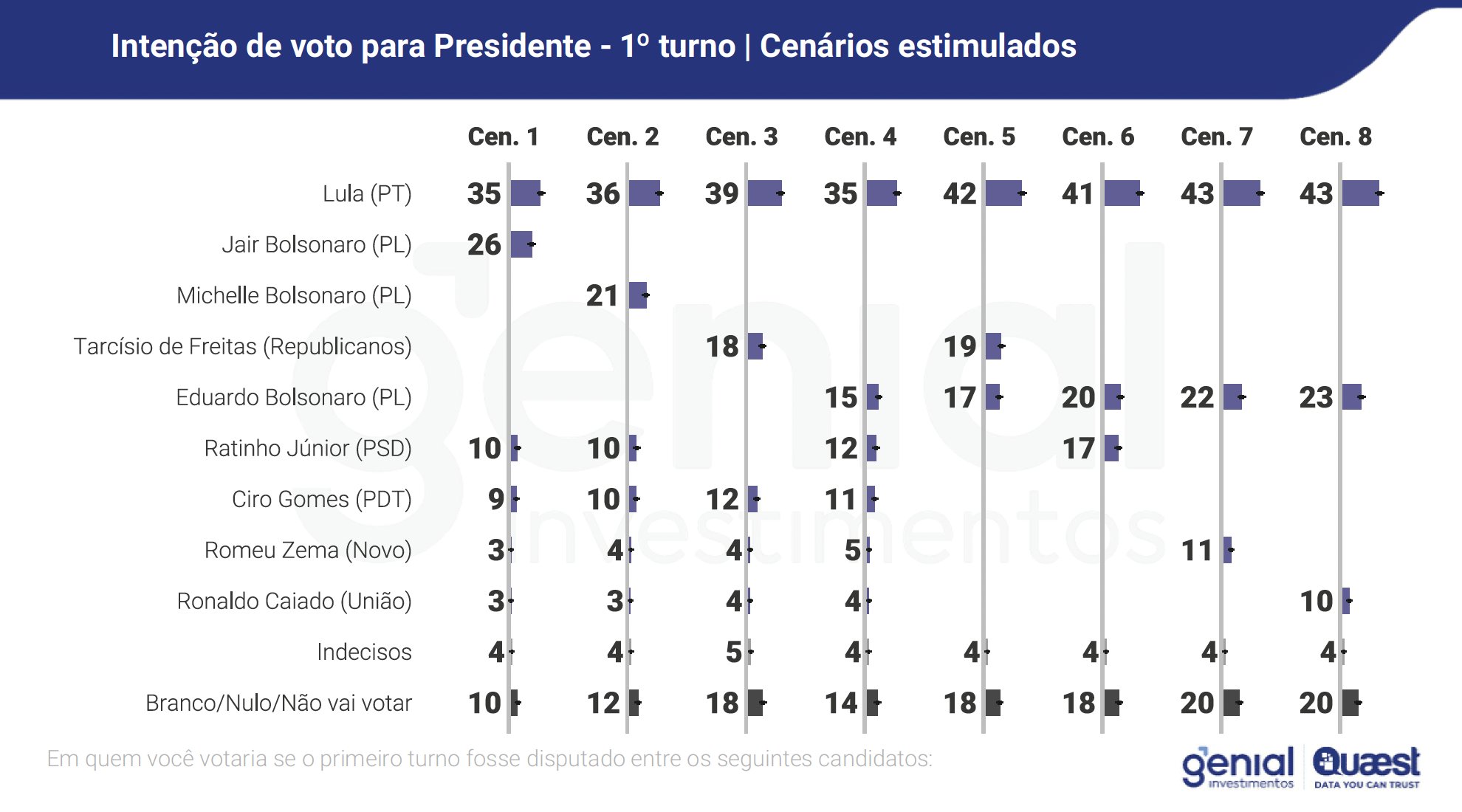 “Genial/Quaest: A um ano da eleição presidencial, Lula mantém liderança em todos os cenários de 1º e 2º turnos”.