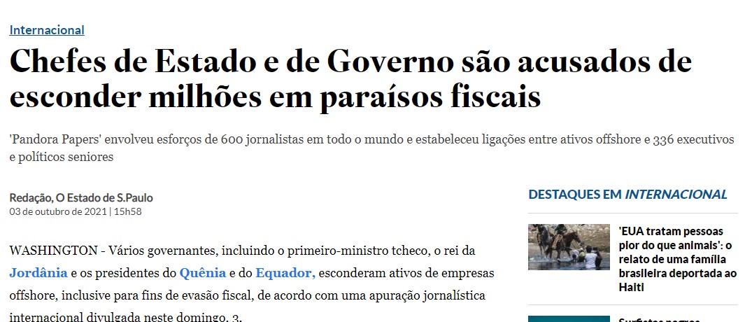 O Estado de S.Paulo publicou apenas uma reportagem sobre a iniciativa ‘Pandora Papers’, mas a notícia não cita o economista.