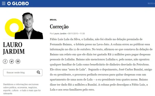 Na ocasião, o jornalista afirmou que Fernando Baiano, lobista preso pela força-tarefa, relatou ter “gastado R$ 2 milhões para pagar despesas pessoais de Lulinha”. Meses depois, em outubro, ele afirmou que Lulinha “não foi citado na delação premiada” e que “a coluna errou ao publicar essa informação”.