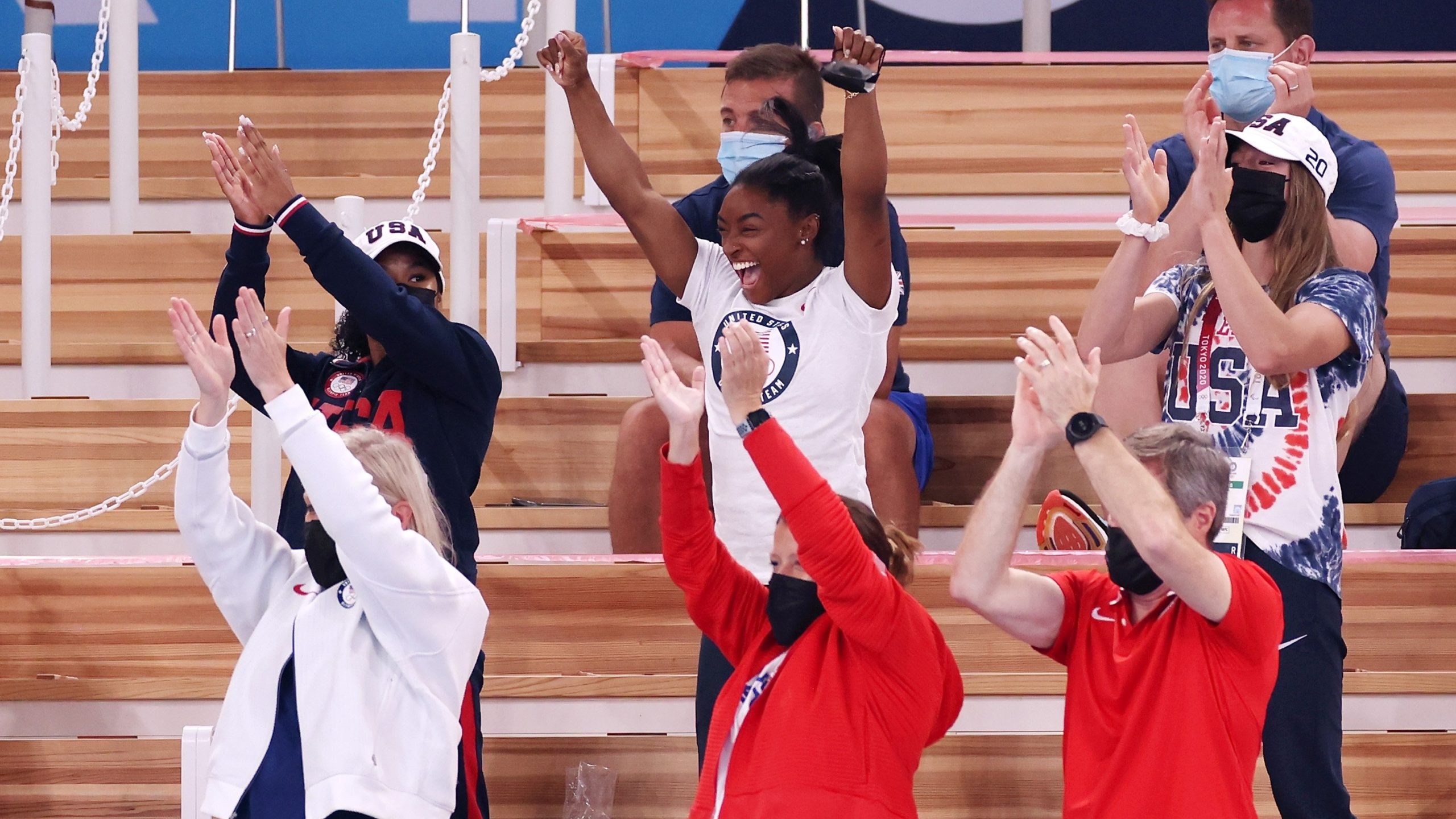 Simone Biles na torcida por Rebeca Andrade em Tóquio