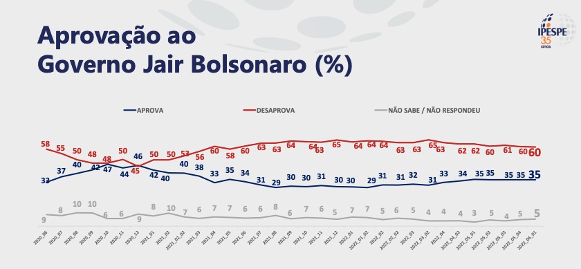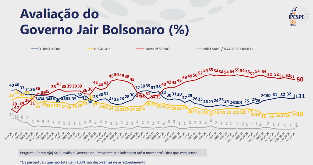 O governo é considerado ruim ou péssimo para 50% dos brasileiros. Desde o início de 2022, houve um recuo acumulado de 5 pontos percentuais, segundo o instituto. Esta é melhor marca para Bolsonaro desde junho de 2021.