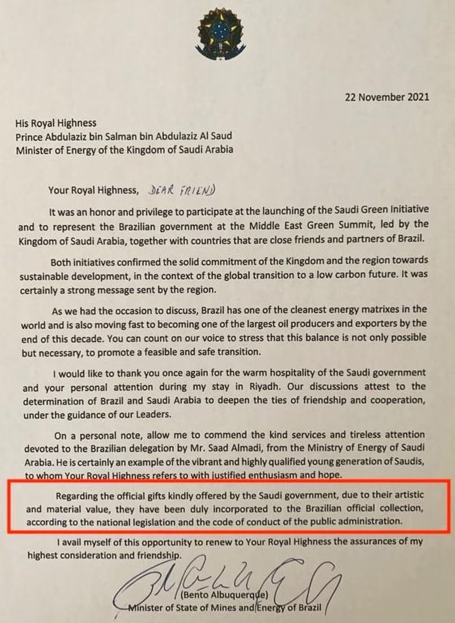 Numa carta endereçada ao príncipe árabe Abdulaziz bin Salman Al Saud, o então ministro de Minas Energia, Bento Albuquerque, informou que as joias, avaliadas em R$ 16,5 milhões, teriam sido incorporadas à “coleção oficial brasileira” conforme determina “a legislação nacional e o código de conduta da administração pública”. O texto não menciona que os objetos foram apreendidos pela Receita Federal.