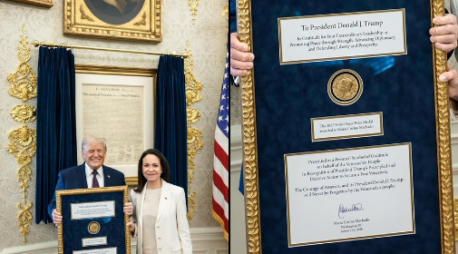 María Corina Machado, vencedora do Prêmio Nobel da Paz em 2025, declarou após a reunião que havia “entregue a medalha” a Trump como forma de reconhecimento político. Segundo ela, o gesto foi feito “em gratidão pelo compromisso do presidente dos Estados Unidos com a liberdade do povo venezuelano”.