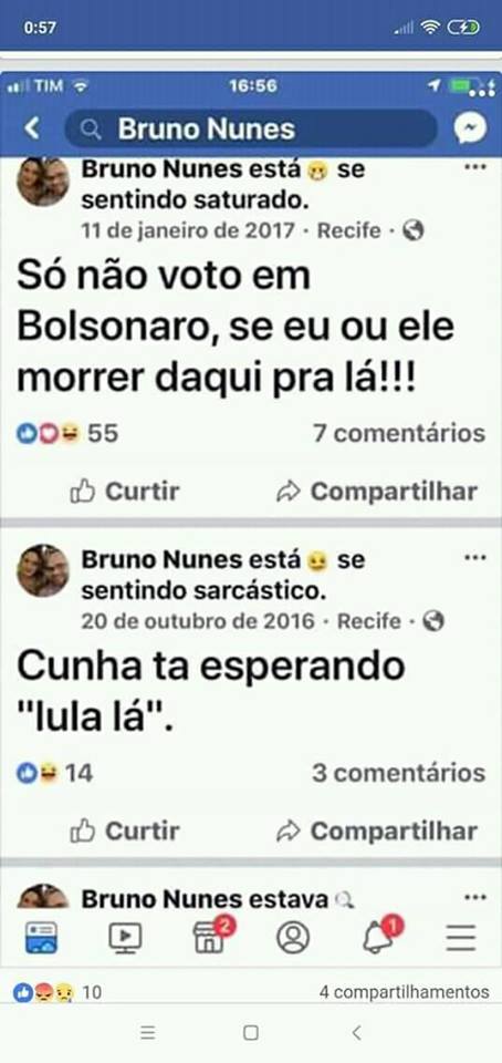 Nas redes sociais, Bruno fez campanha para Bolsonaro e aparece sendo batizado por um pastor evangélico numa praia.