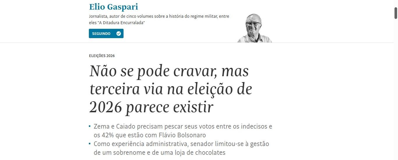 Em artigo intitulado “Não se pode cravar, mas terceira via na eleição de 2026 parece existir”, publicado na Folha de S.Paulo neste domingo (19) o jornalista Elio Gaspari faz uma análise do que crê ser a viabilidade eleitoral da chamada “terceira via” na eleição presidencial de outubro, hoje personificada nos pré-candidatos Romeu Zema (NOVO-MG) e Ronaldo Caiado (PSD-GO). Confira trechos: