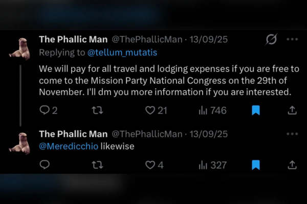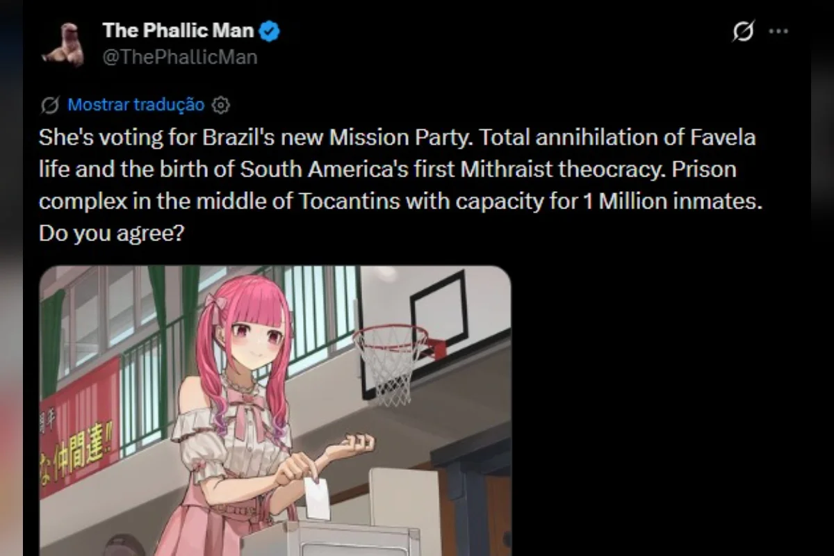 Outro ponto citado é que, no mesmo perfil em que faz propaganda extremista, The Phallic Man falou em nome do Missão ao convidar o dono da J’Accuse para vir ao Brasil com despesas pagas para participar do congresso nacional do partido. Renan negou que o perfil representasse oficialmente a legenda.