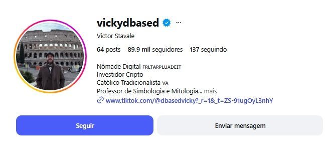 O perfil de Victor Stavale no Instagram é ativo e verificado pela plataforma, com quase 90 mil seguidores. Ele se define publicamente como nômade digital, investidor em criptomoedas e católico tradicionalista. Procurado, o influenciador afirmou que as acusações são falsas e declarou que sua equipe jurídica acompanha o caso.