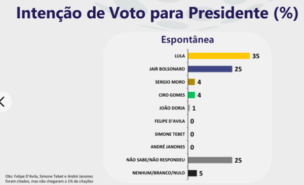 Na pesquisa espontânea, começa a se notar uma dinâmica preocupante para a oposição, que é o crescimento lento, mas constante, de Bolsonaro desde o final do ano passado, embora este ainda não tenha ultrapassado a marca psicológica de 25% a 26%, que é o seu máximo. Hoje ele tem 25% .