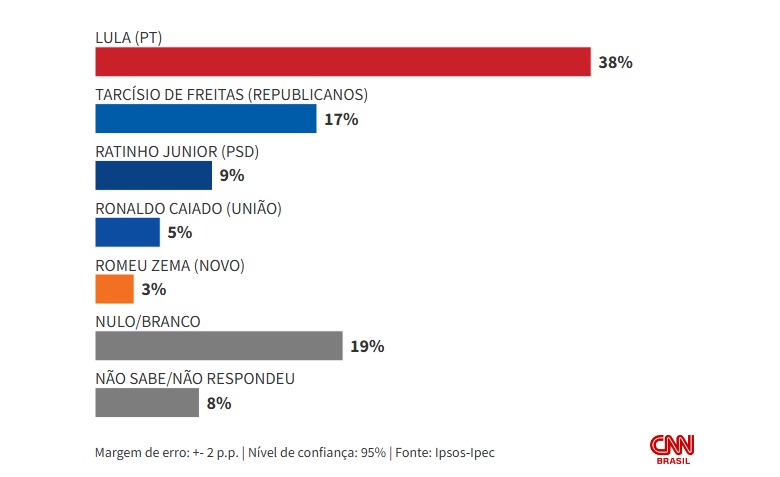 No primeiro cenário, com Tarcísio de Freitas como principal adversário, Lula tem 38%, Tarcísio registra 17%, Ratinho Junior aparece com 9%, Ronaldo Caiado tem 5% e Romeu Zema soma 3%. Brancos e nulos chegam a 19%, enquanto 8% não souberam ou não responderam.