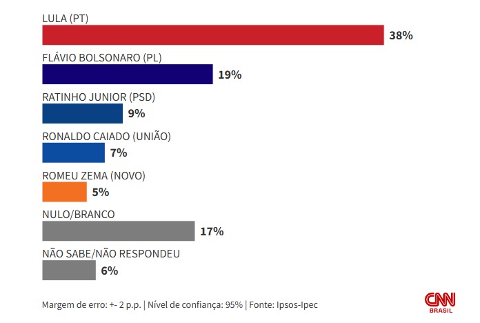 No segundo cenário, com Flávio Bolsonaro como candidato, Lula mantém os 38%. Flávio marca 19%, Ratinho Junior tem 9%, Caiado sobe para 7% e Zema fica com 5%. Brancos e nulos somam 17% e os indecisos, 6%.