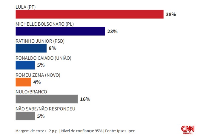 No terceiro cenário, com Michelle Bolsonaro na disputa, Lula permanece com 38% e a ex-primeira-dama aparece com 23%, o melhor desempenho entre os nomes da oposição. Ratinho Junior registra 8%, Caiado tem 5% e Zema, 4%. Brancos e nulos ficam em 16%, e 5% não souberam responder.