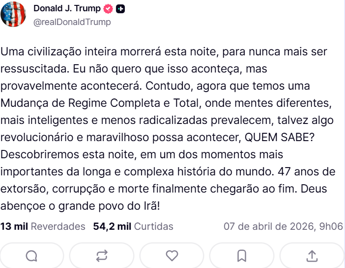Trump, por sua vez, intensificou as ameaças. Em uma postagem no Truth Social, o presidente dos EUA declarou que “uma civilização inteira morrerá esta noite”, ao referir-se ao prazo final para que o Irã reabra o Estreito de Ormuz. A declaração foi feita após várias autoridades iranianas mostrarem sinais claros de que não pretendem ceder.