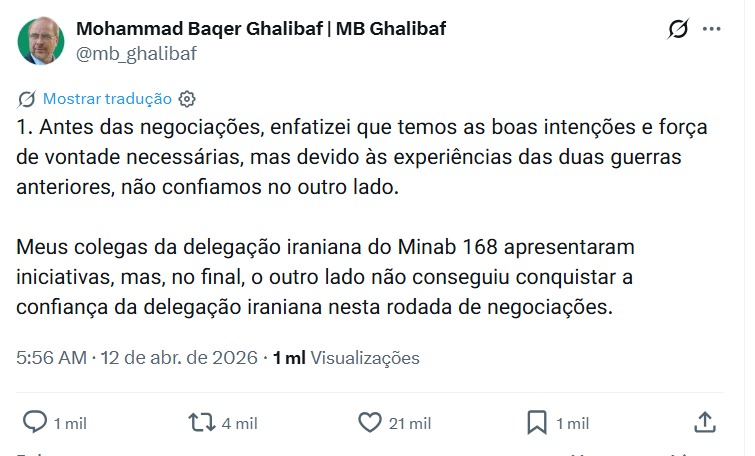 Em uma série de publicações na rede X, Ghalibaf declarou que, antes mesmo do início das conversas, deixou claro que o Irã estava disposto a negociar com boa-fé, mas carregava desconfiança em razão das experiências recentes de guerra.