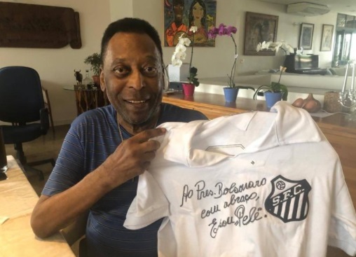 Mas escreveu numa camisa do Santos: “Ao Pres. Bolsonaro com abraço, Edson Pelé”.