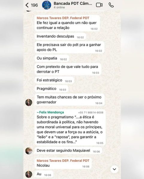 Félix Mendonça encerrou a discussão citando Maquiavel e dizendo que, para Ciro, “a ética parece subordinada à política”. Segundo ele, o pedetista estaria usando a “astúcia da raposa” para garantir poder e influência no novo partido. O tom das mensagens evidencia que a ruptura entre Ciro e o PDT foi marcada não apenas por diferenças ideológicas, mas por ressentimentos pessoais acumulados ao longo dos últimos anos.