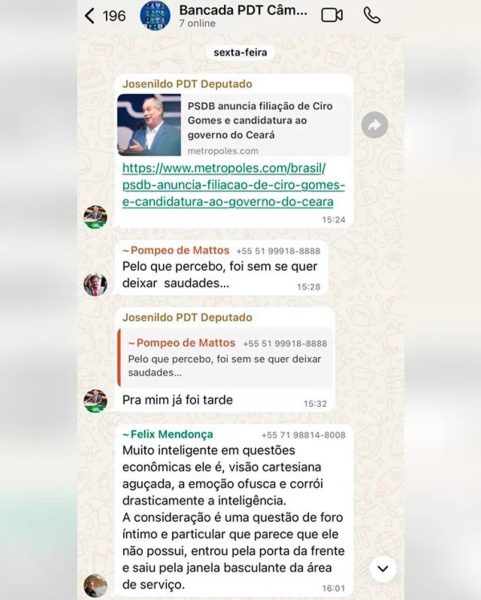 Entre os comentários, o deputado Pompeo de Mattos (RS) ironizou a decisão de Ciro, dizendo que ele “saiu sem deixar saudades”. O colega Joseni Ildo (AP) respondeu de forma ainda mais direta: “Pra mim já foi tarde”. As mensagens rapidamente evoluíram para uma troca de análises políticas e desabafos sobre o papel do ex-ministro dentro do partido.