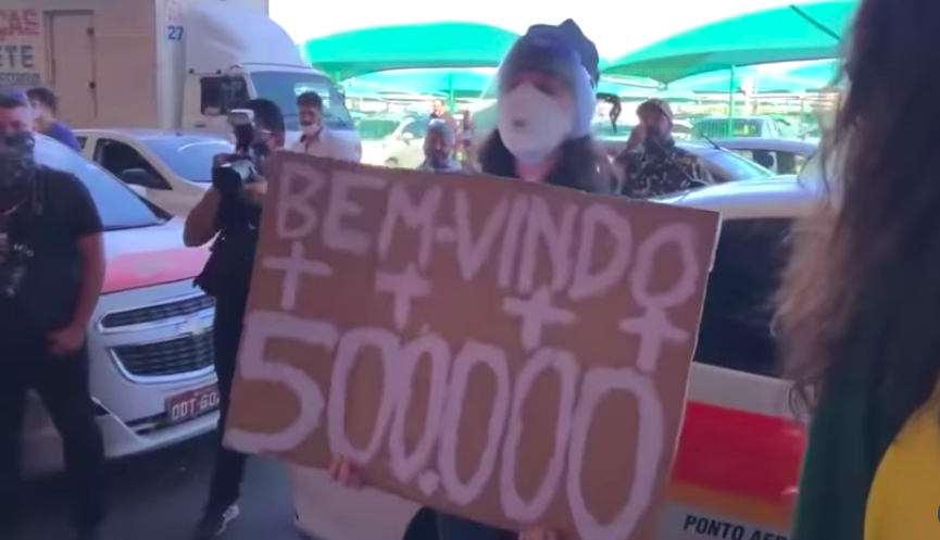 Usando máscara do tipo N95 e face shield, a moça exibiu em silêncio um cartaz escrito “Bem-vindo, 500.000”, referência ao número de mortes no país pela Covid 19. As duas palavras, o número e algumas cruzes desenhadas foram estopim para a fúria bolsonarista.