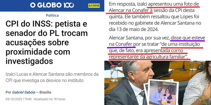1️⃣ O @JornalOGlobo cometeu um erro factual grosseiro ao dizer (imagem abaixo) que o senador @IzalciLucas “apresentou uma foto de Alencar na Conafer”. O que o senador mostrou na CPMI do INSS foi uma foto da minha chefe de gabinete recebendo,… pic.twitter.com/jXhOEUA4Qp— Dep. Alencar Santana (@AlencarBraga13) October 4, 2025