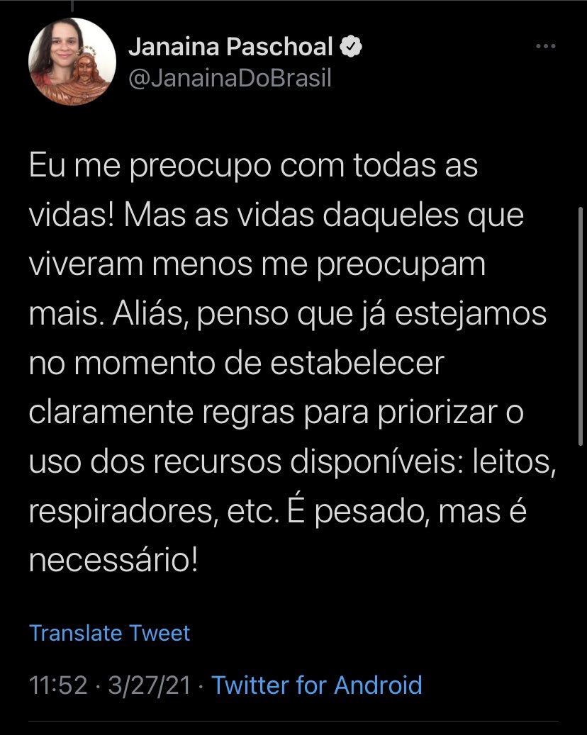 Eu me preocupo com todas as vidas! Mas as vidas daqueles que viveram menos me preocupam mais. Aliás, penso que já estejamos no momento de estabelecer claramente regras para priorizar o uso dos recursos disponíveis: leitos, respiradores, etc. É pesado, mas é necessário!