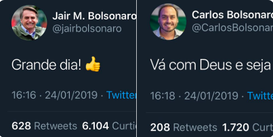 Bolsonaros Jair e Carlos celebraram o fato à sua maneira. Negaram depois que fosse referência a Jean.